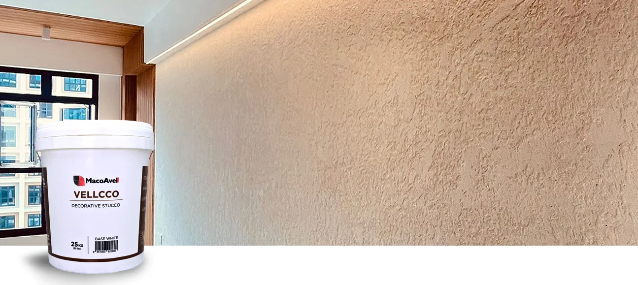 - Apply VELLCCO Stucco (about 1mm thickness ) with a flexible steel trowel, spread evenly throughout the wall.